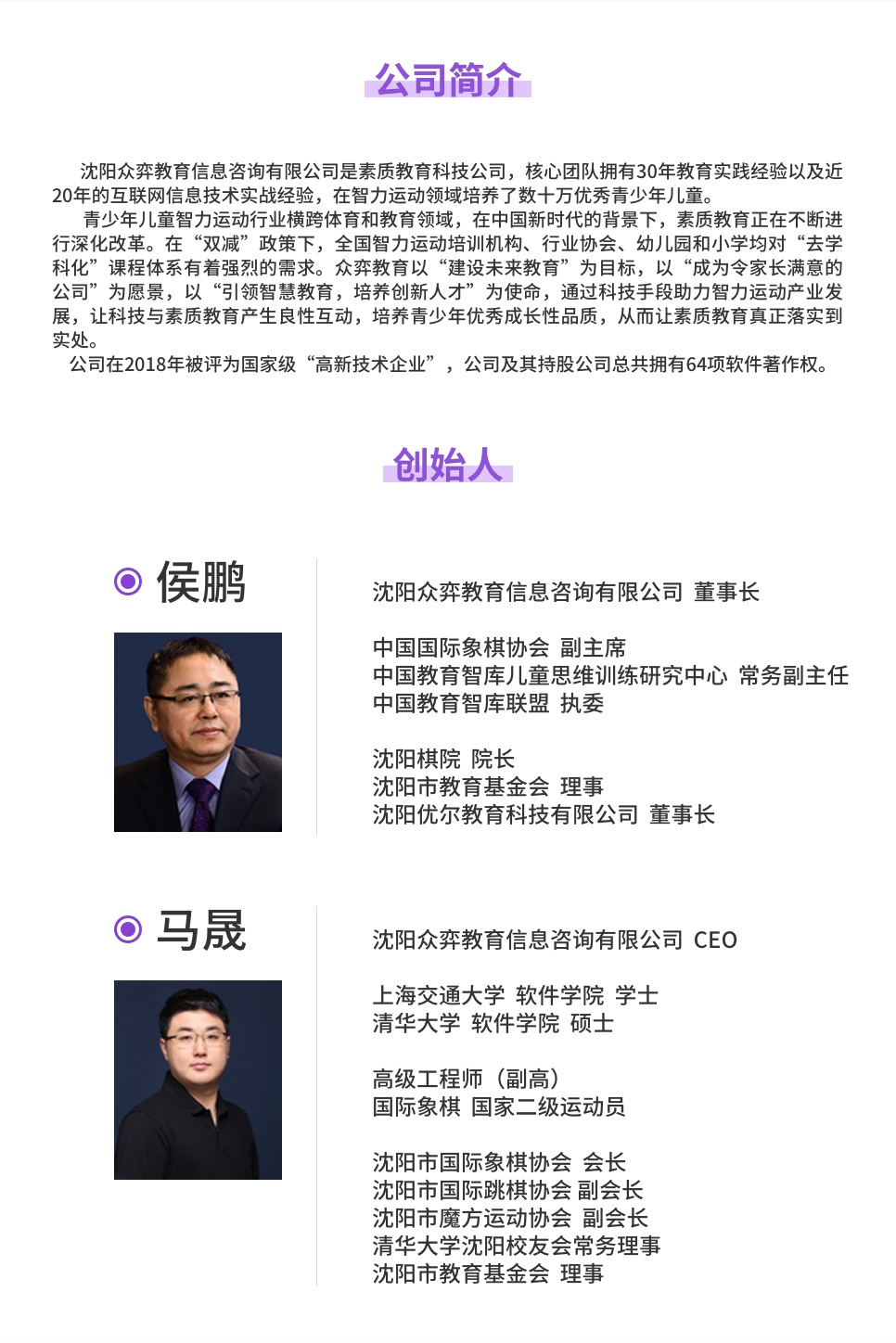 众弈教育为国内出版棋类书籍最大的出版传媒集团公司———城市传媒(600229),定向研发了“弈趣学堂”、“棋妙之旅”、“憨爸对弈室”等国际象棋、围棋软件产品,辐射百万用户人群。